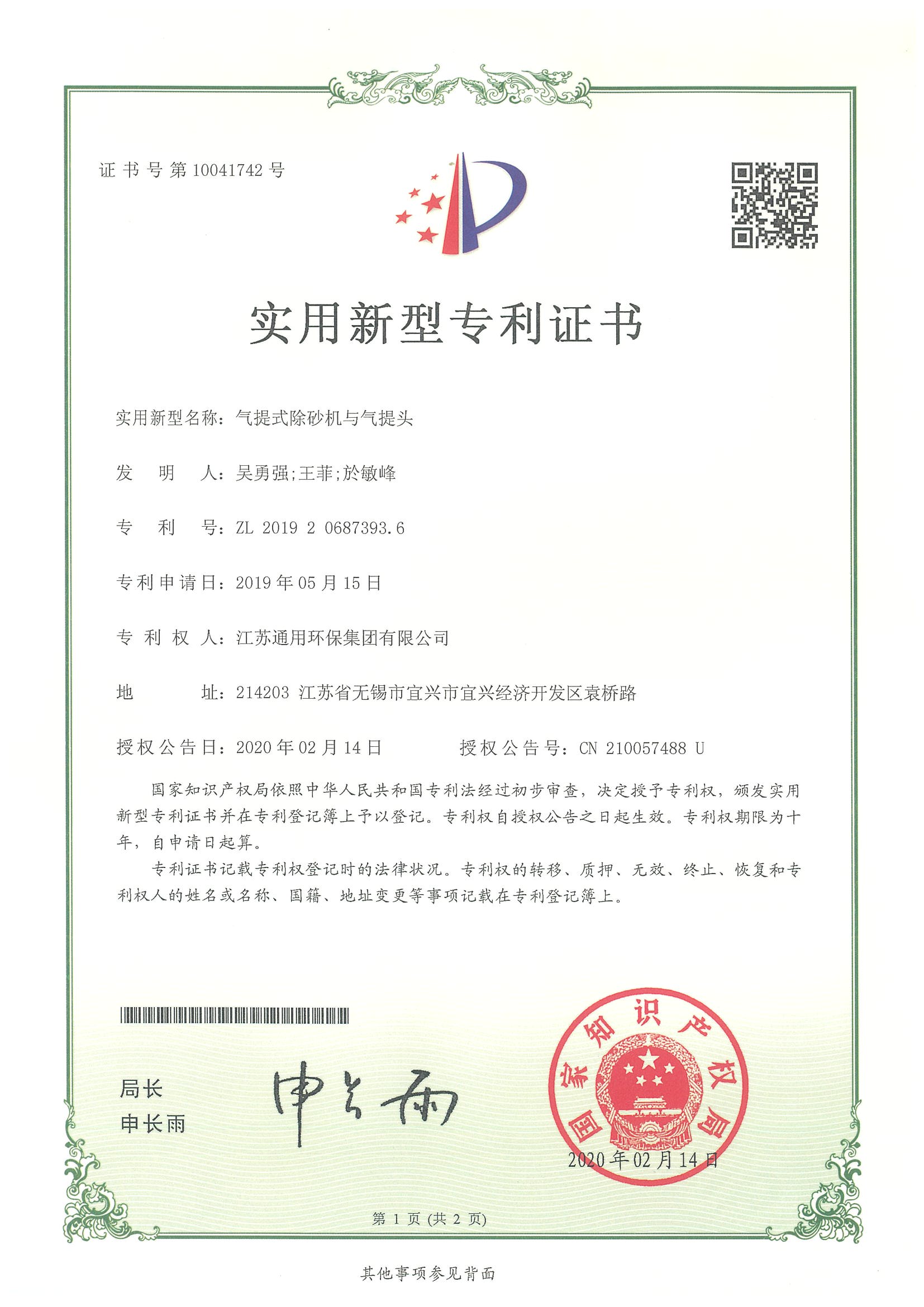 Utility model patent certificate for an air-lift sand remover and air-lift head, February 4, 2020