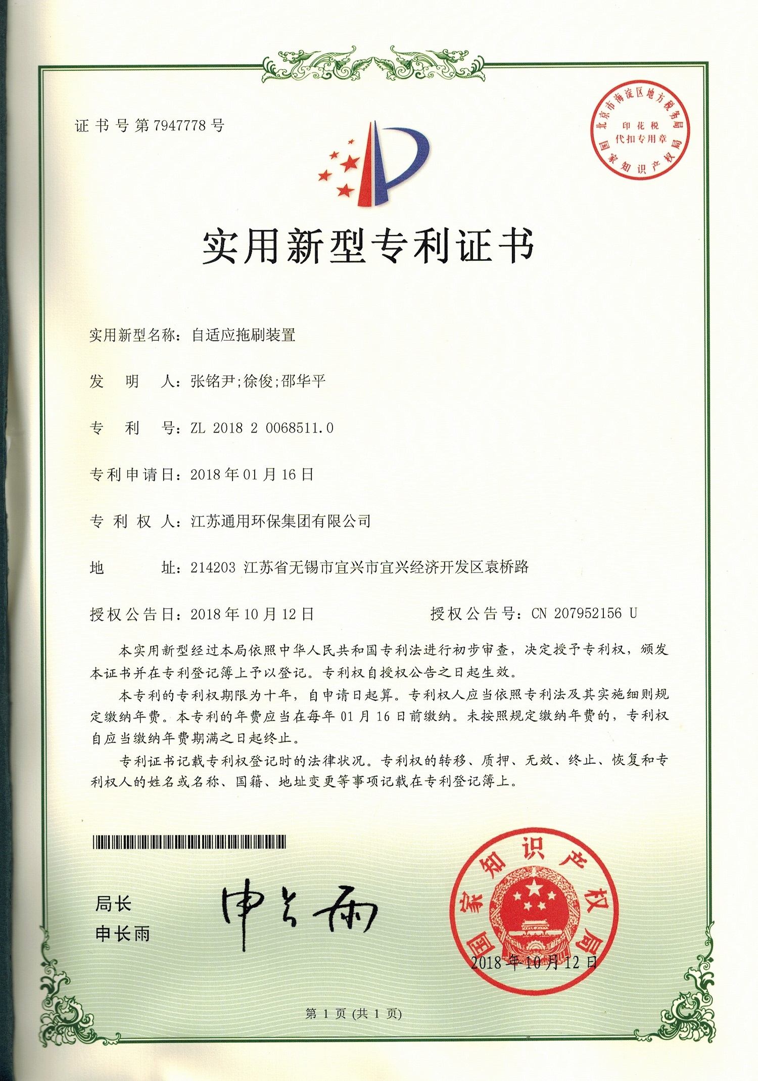 Utility model patent certificate for an adaptive floor brushing device, October 12, 2018