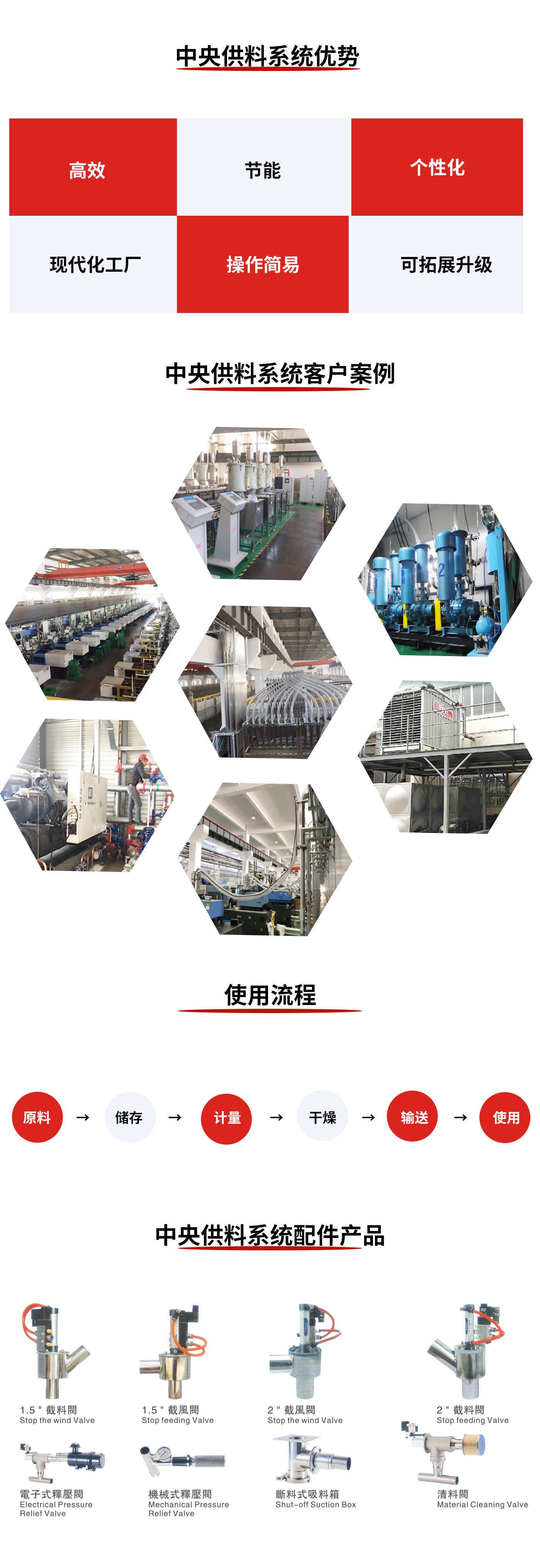 中央供料欧亿体育(中国)主要组成部分包括:中央控制站、旋风集尘器、脉动集尘器、原料分配站、储料桶、拌料机、干燥机、除湿机、称重式搅拌机、中央式料斗、粉碎机、机边粉碎机、机械手、截风阀、截料阀、及料管和风管等等。